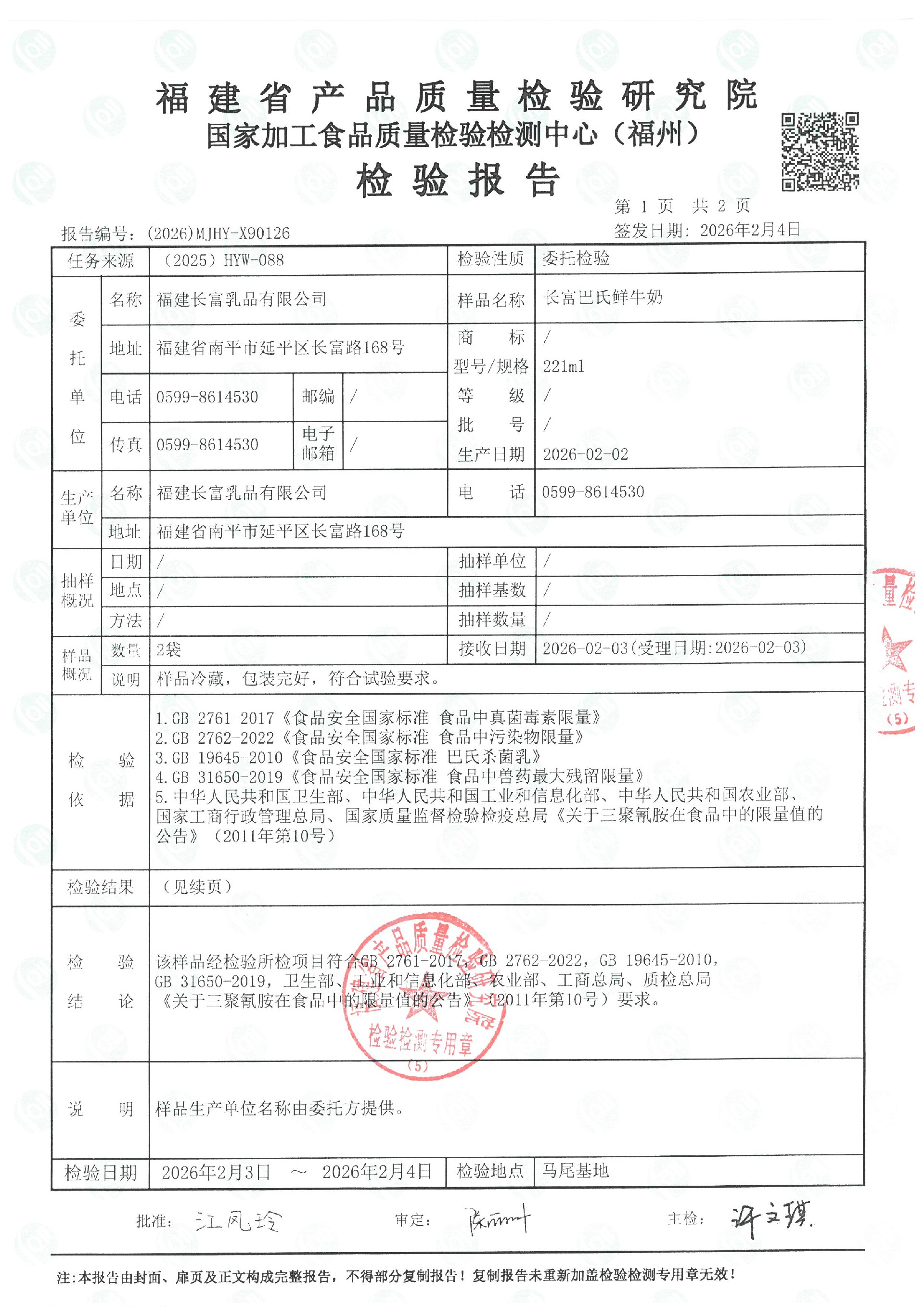 長富牛奶2026年2月5日省質檢院冷鏈產品檢測報告