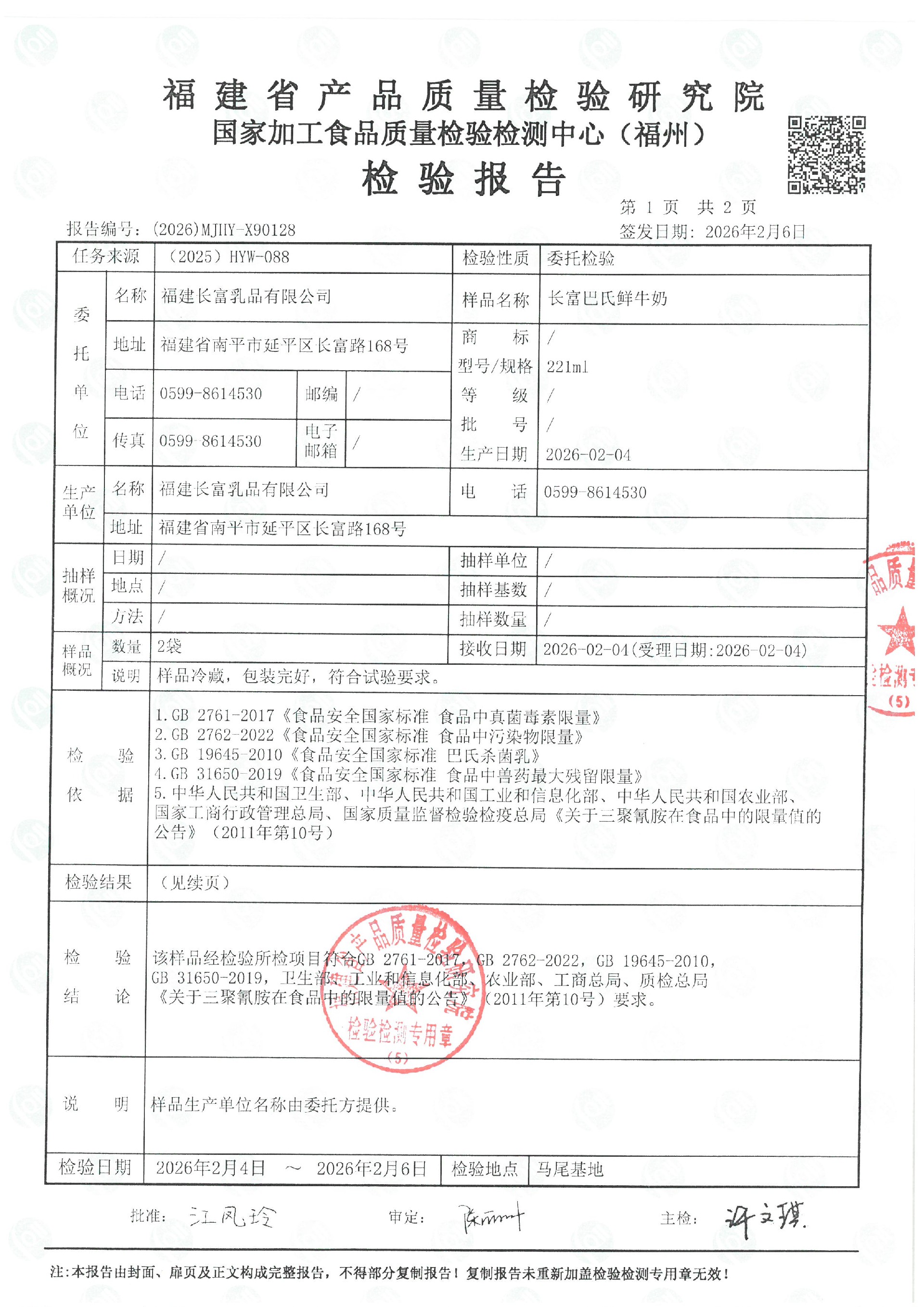 more長富牛奶2026年2月6日省質檢院冷鏈產品檢測報告