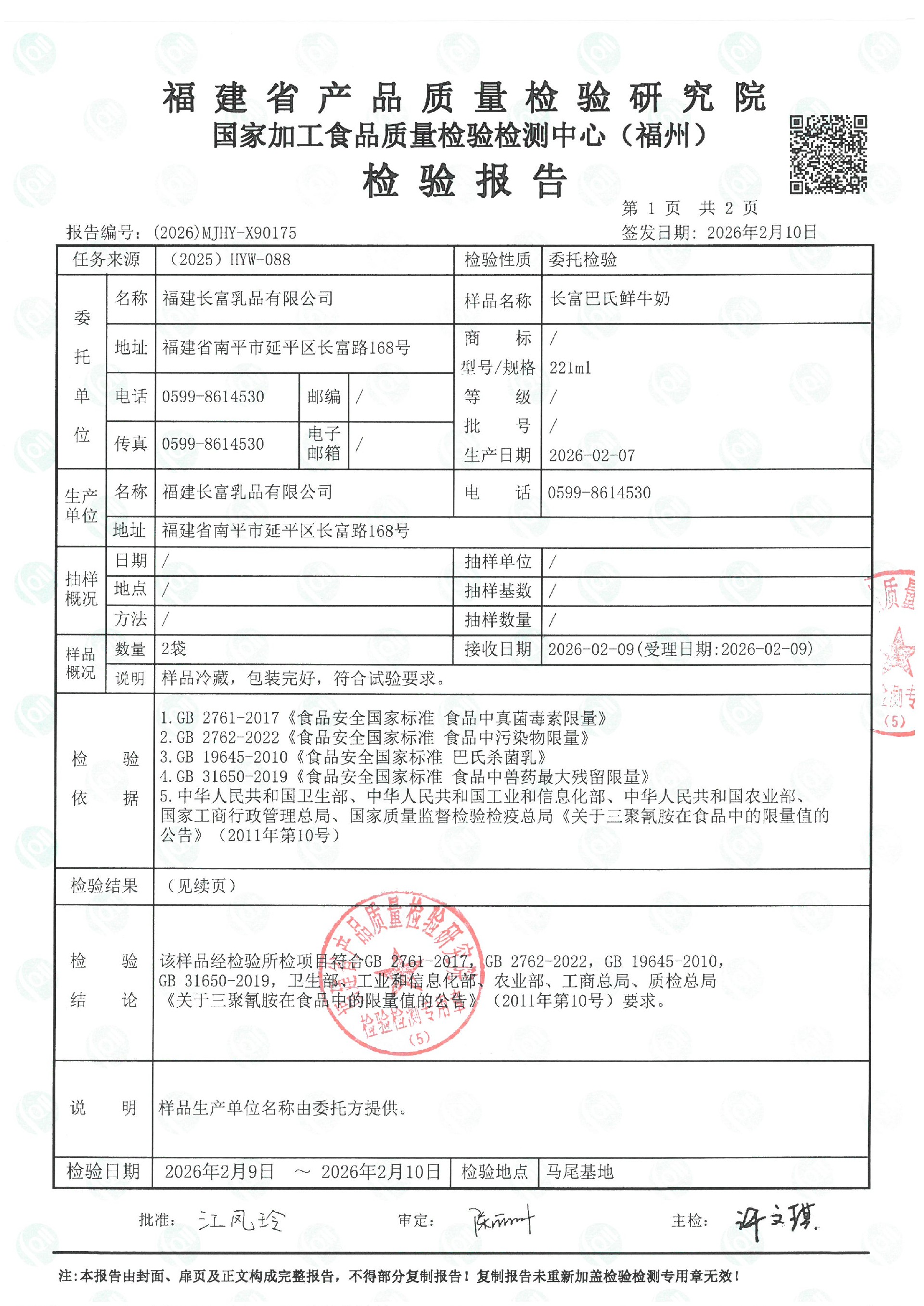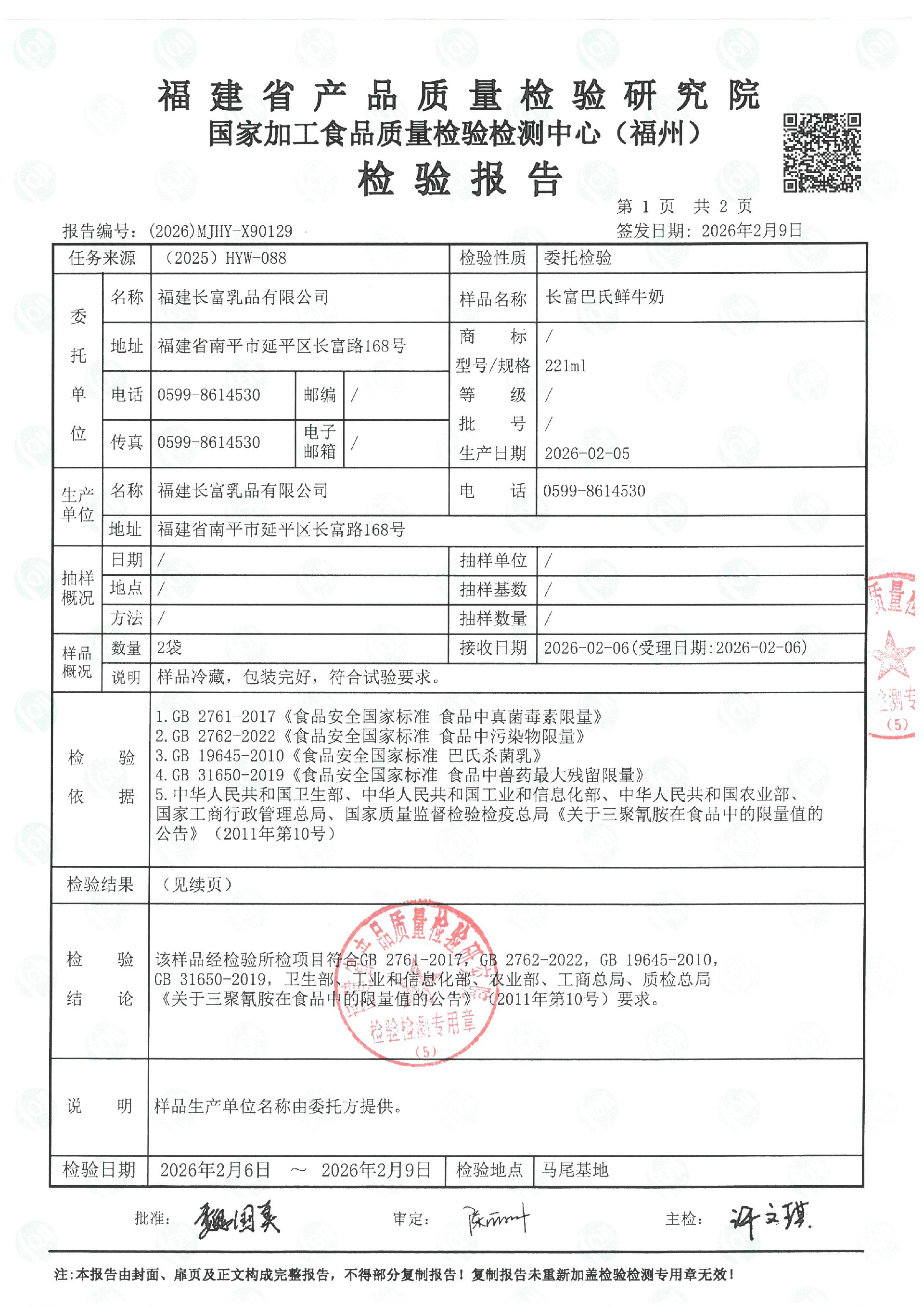 more長富牛奶2026年2月9日省質檢院冷鏈產品檢測報告