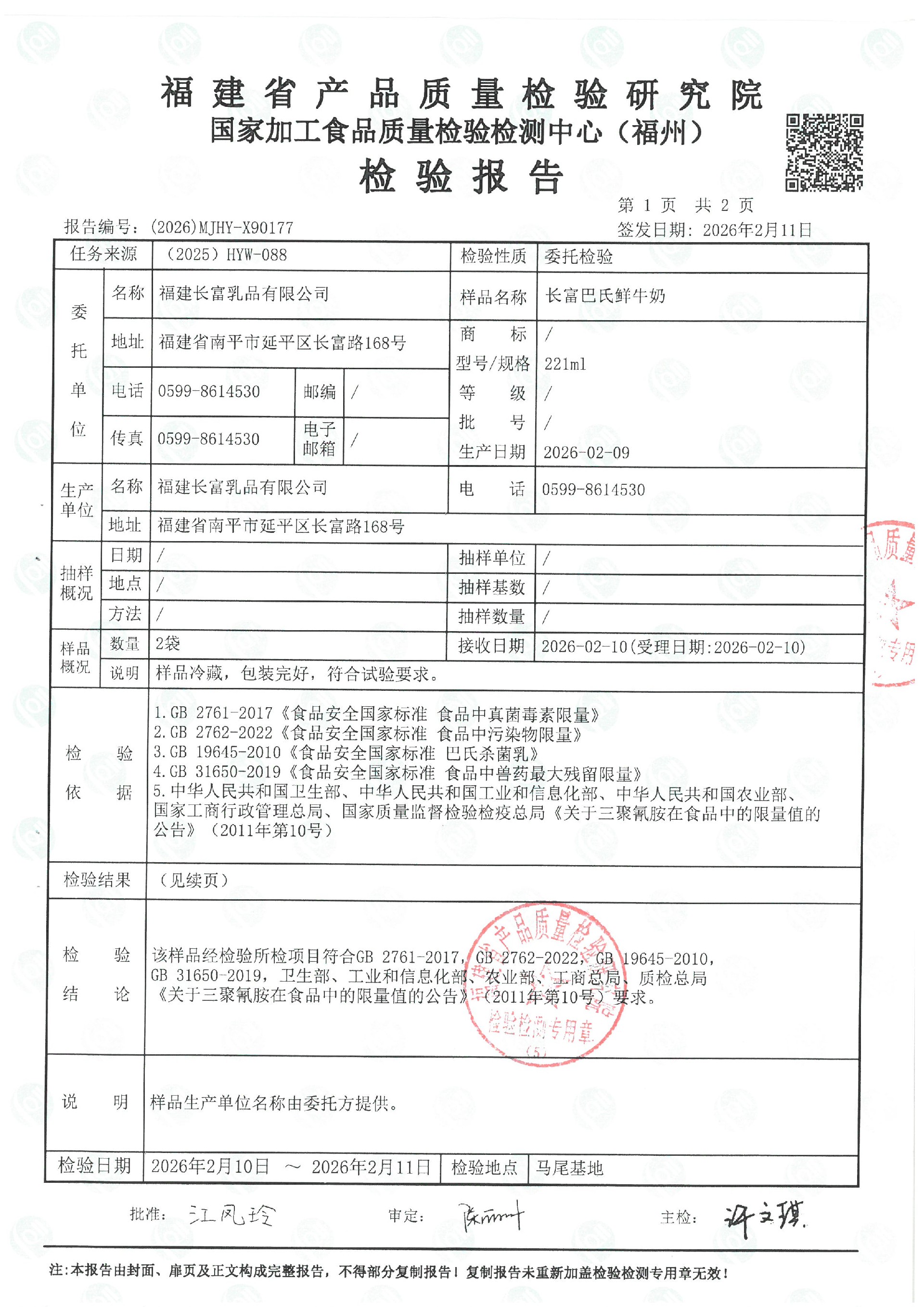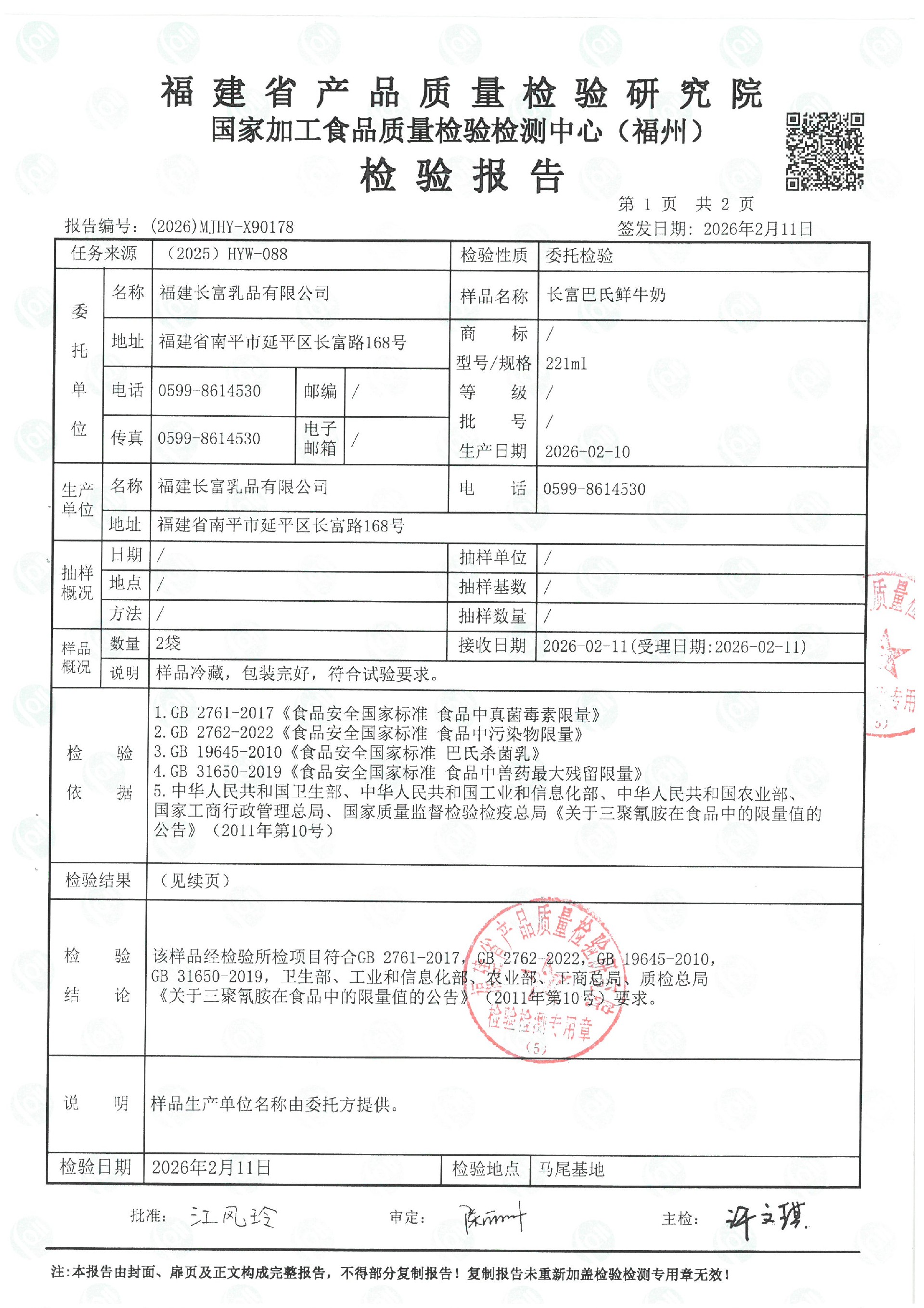 more長富牛奶2026年2月7日省質檢院冷鏈產品檢測報告