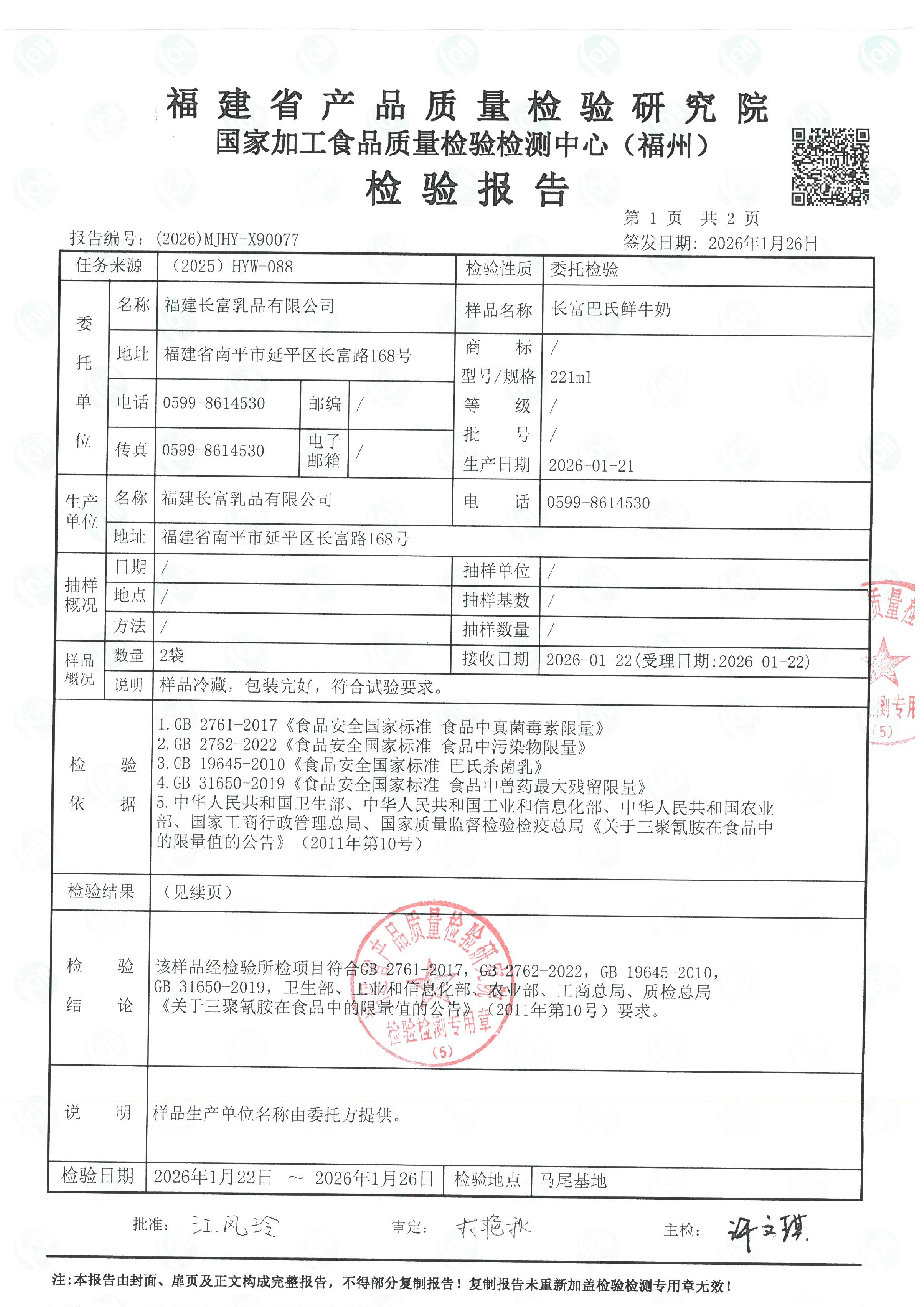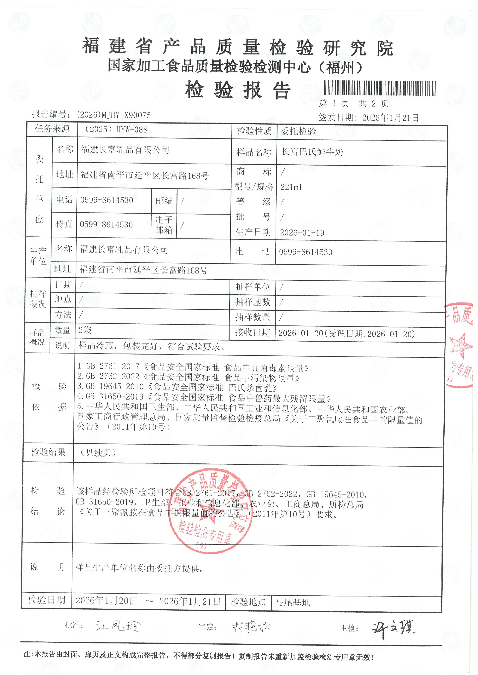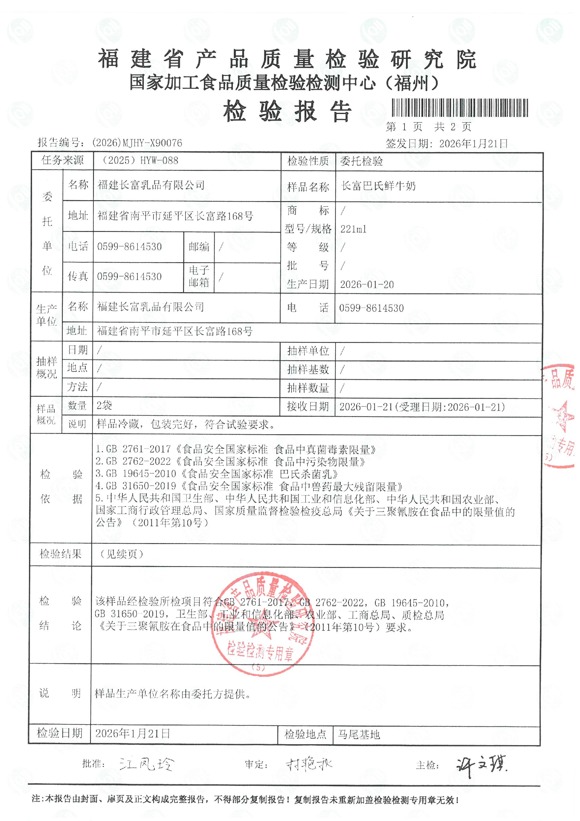 more長富牛奶2026年1月21日省質檢院冷鏈產品檢測報告