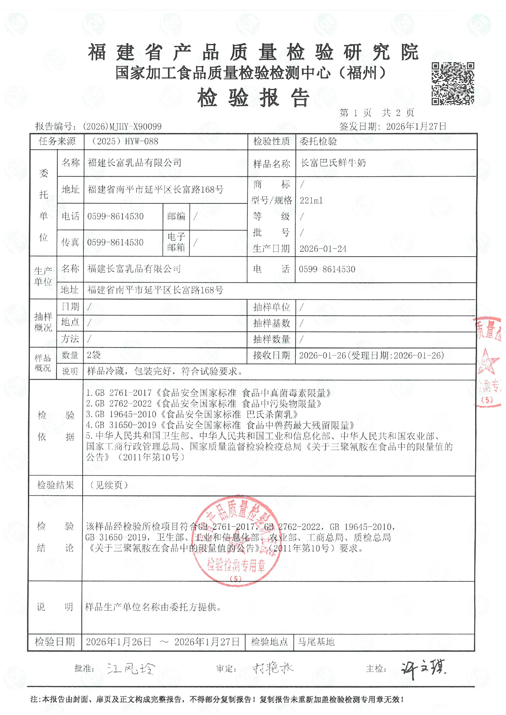 more長富牛奶2026年1月24日省質檢院冷鏈產品檢測報告
