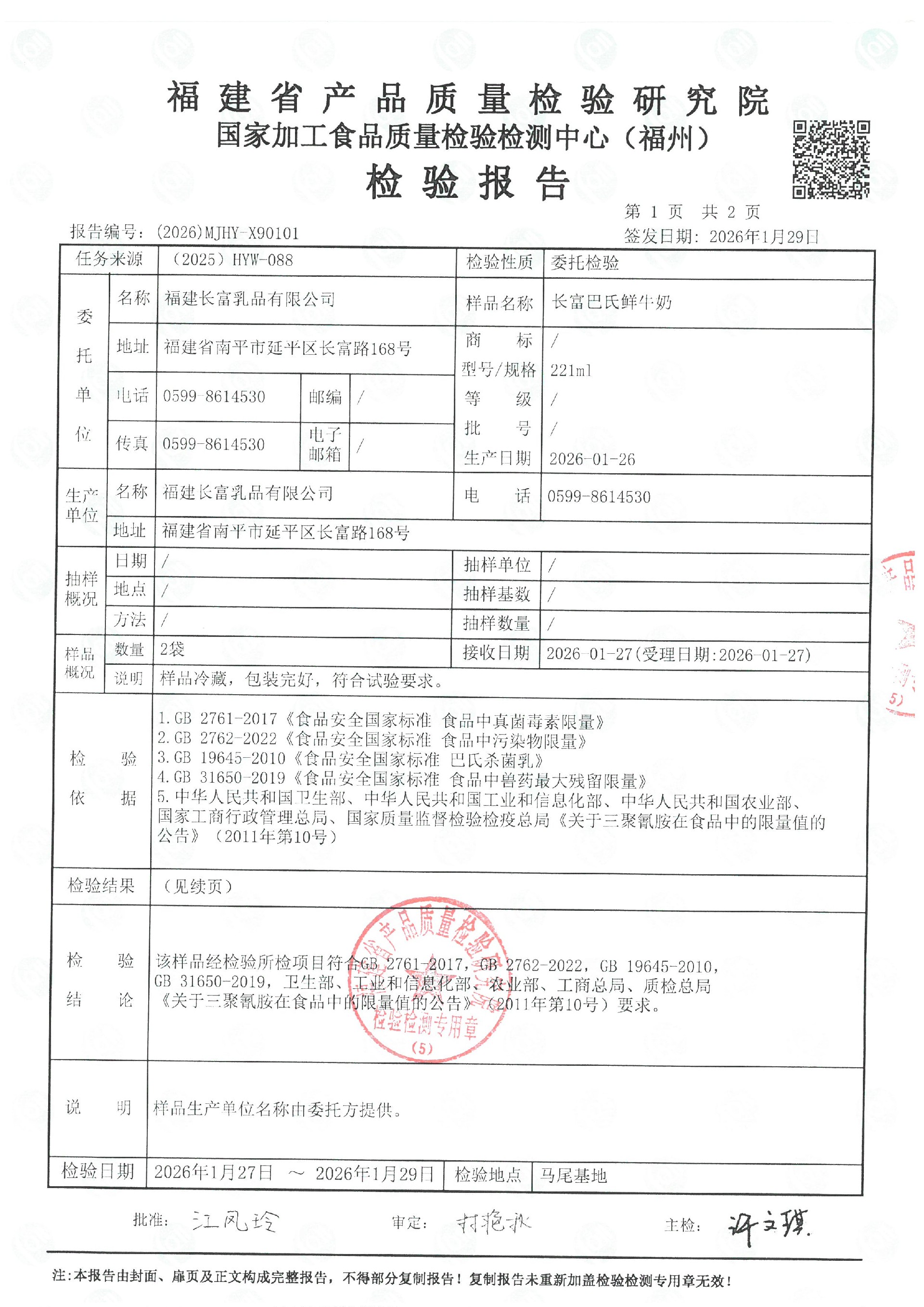 more長富牛奶2026年1月26日省質檢院冷鏈產品檢測報告
