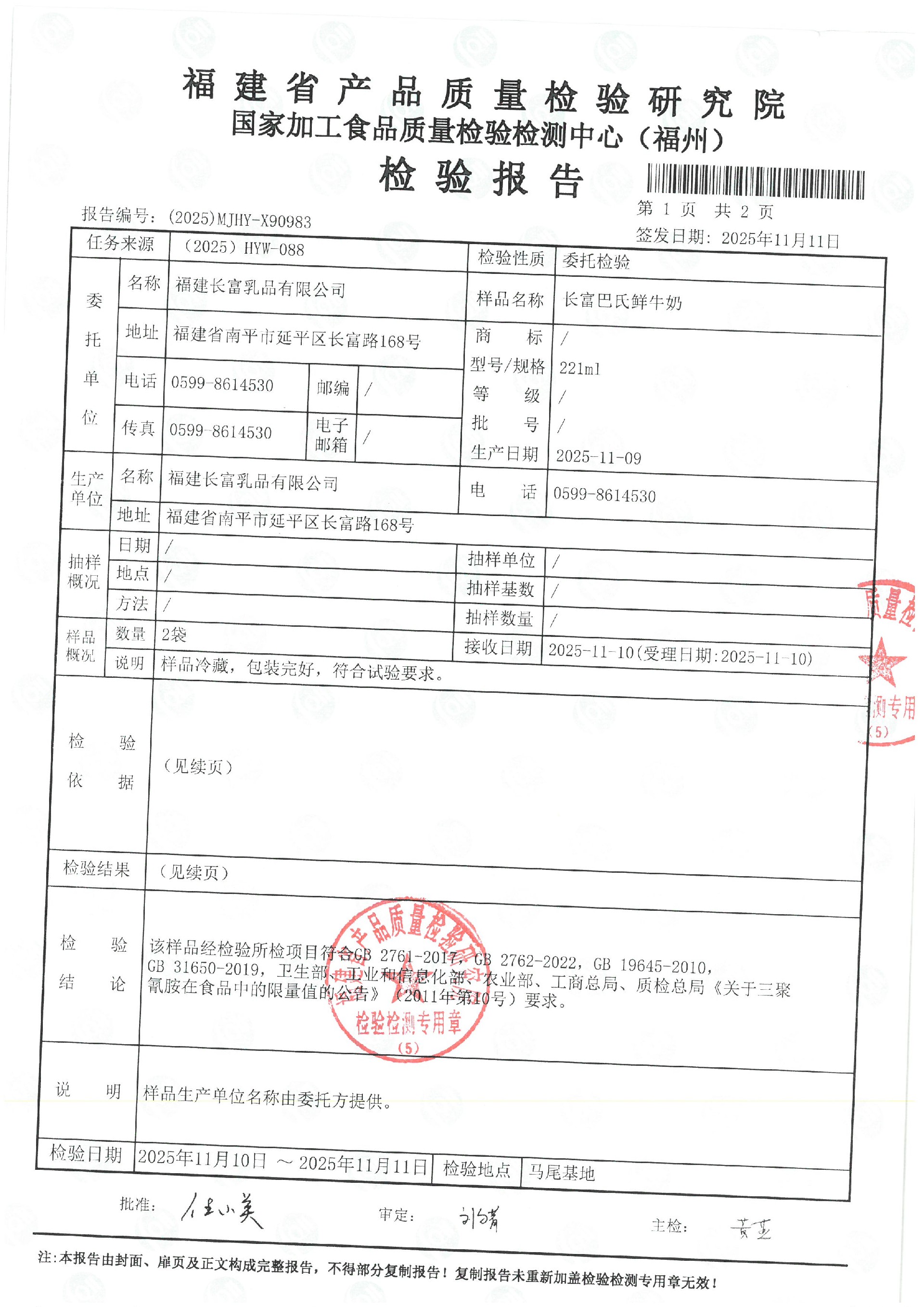more長富牛奶2025年11月7日省質檢院冷鏈產品檢測報告
